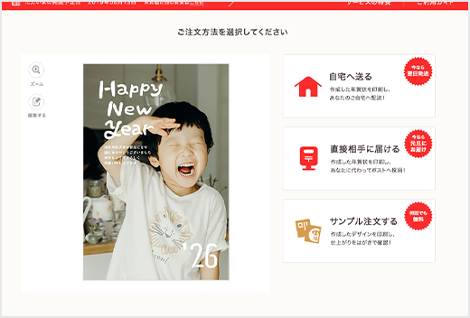 デザイン作成後、「注文方法の選択」の画面の「サンプル注文する」ボタンをクリックしお手続きしてください。